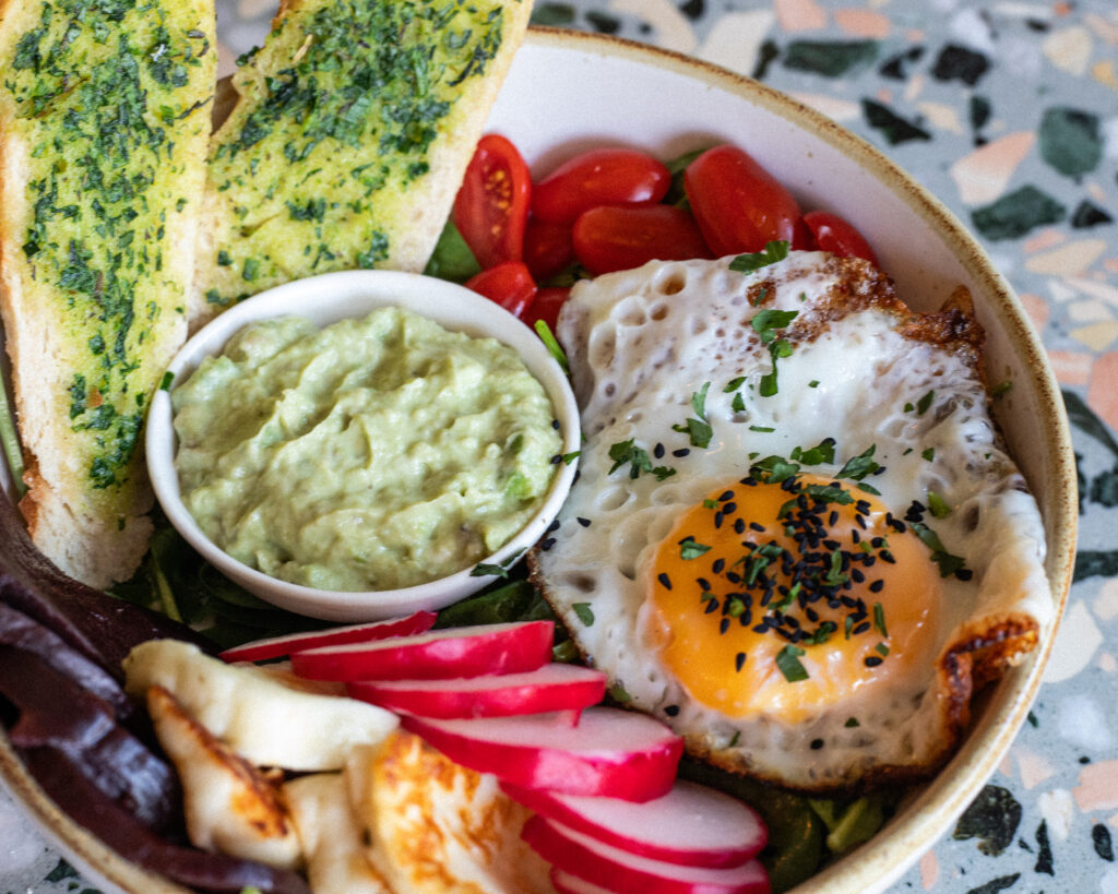 liście szpinaku, grillowane halloumi, jajko sadzone, plastry awokado oraz buraka, pomidorki koktajlowe, rzodkiewka, 2 grzanki z masłem czosnkowym